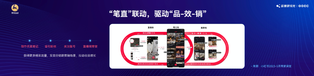 最后,Penny 還總結(jié)了小紅書的流量閉環(huán)、商業(yè)閉環(huán),以及帶來了小紅書最新的直播趨勢分享,認為未來在小紅書,品牌可以通過筆記引流直播帶貨,來驅(qū)動“品-效-銷”(品牌、效果、銷量)。