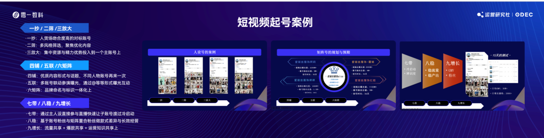 比如關(guān)于如何用短視頻起號,他用 PPT 總結(jié)了一套方法論:一抄、二篩、三放大;四鋪、五聯(lián)、六矩陣;七帶、八穩(wěn)、九增長(具體細節(jié)可放大圖片查看)。