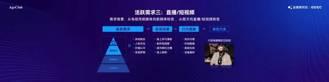 三、直播/短視頻。老年人的視頻、直播娛樂需求正在從電視傳統(tǒng)媒體向新媒體轉(zhuǎn)變,圖文娛樂需求向直播/短視頻轉(zhuǎn)變。