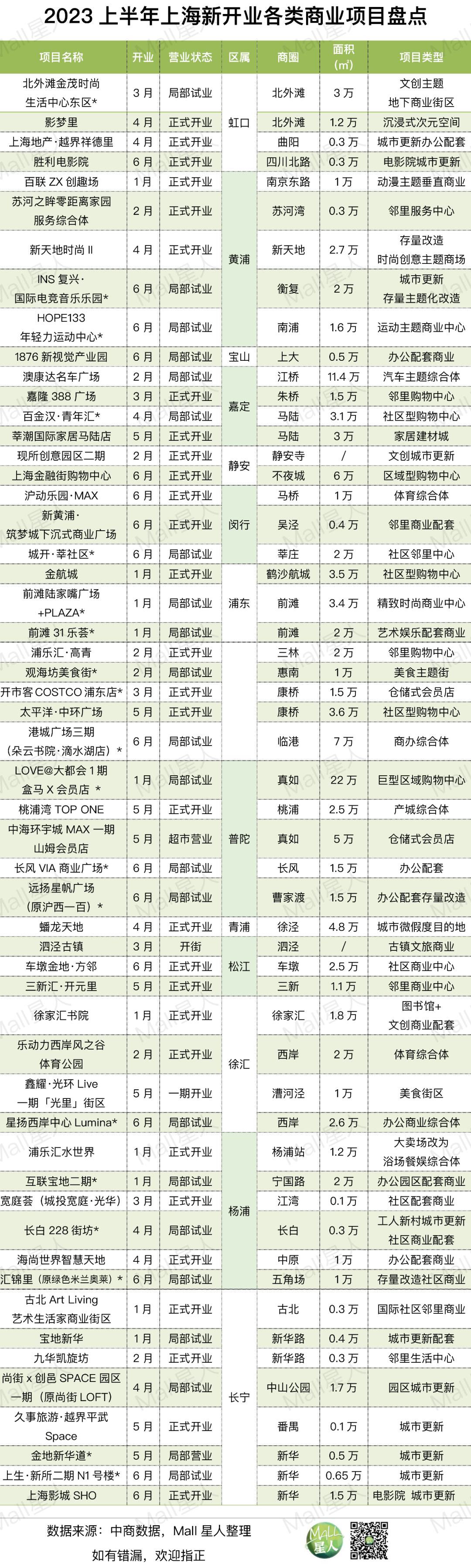 Mall星人已經(jīng)疏理過2023年新開業(yè)項(xiàng)目Q1季報和Q2季報,本文旨在綜合回顧上半年上海商業(yè)地產(chǎn)的整體動態(tài)。上半年,魔都迎來了新一輪項(xiàng)目開業(yè)小高峰,新開業(yè)/局部試營業(yè)的54個項(xiàng)目,分布在全市13個區(qū)域,較去年同期明顯提升,但與此同時,也有不少因種種原因選擇停業(yè)的項(xiàng)目。