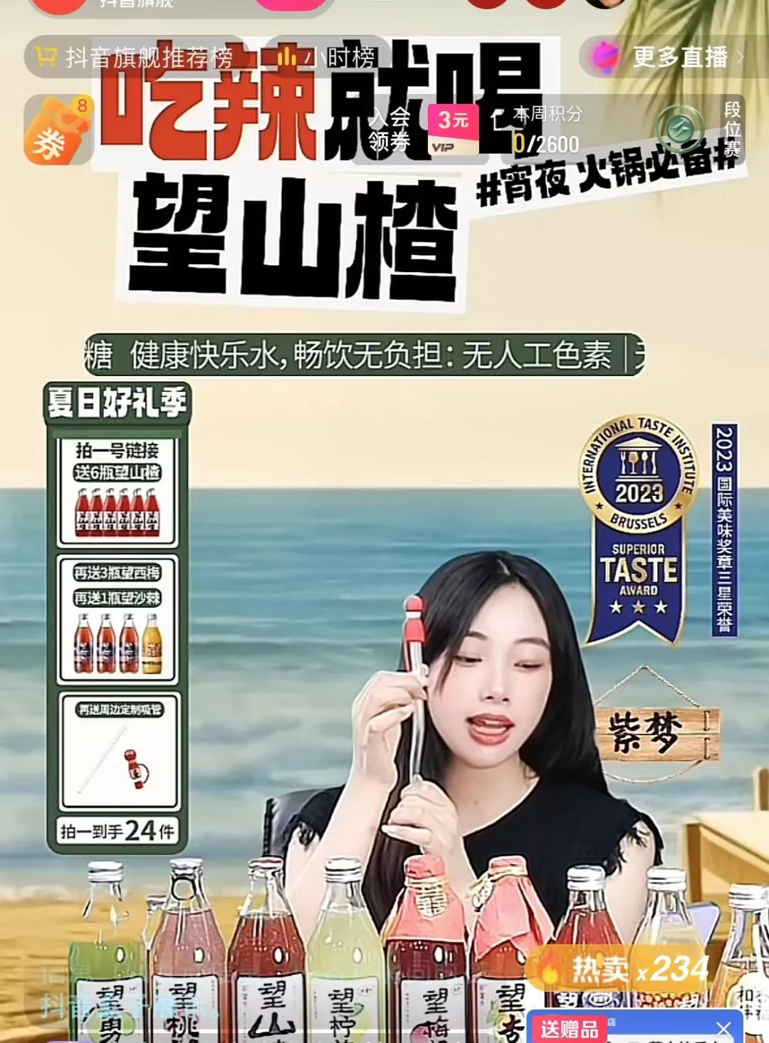 望山楂的成功營銷離不開其對短視頻內(nèi)容的掌握。當(dāng)這批內(nèi)容已經(jīng)在抖音得到相當(dāng)?shù)膫鞑ザ葧r,好望水官方旗艦店等賬號也趁熱打鐵在其直播間中循環(huán)播放起了“咕嚕嚕子,嘎辣辣子,嘎辣辣子啦!