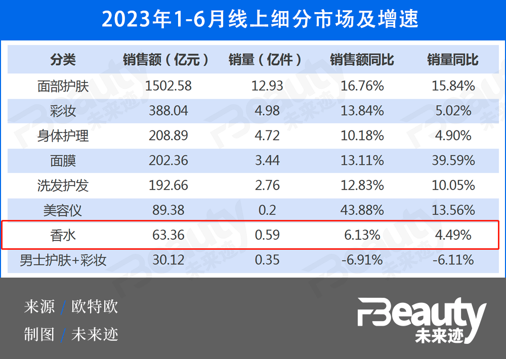 數(shù)據(jù)顯示:2023年1-6月線上全網(wǎng)香水品類銷售額總計(jì)近63.4億元,同比增長6.13%。在面部護(hù)膚、身體護(hù)理、發(fā)用洗護(hù)、彩妝、美容儀和男士美妝等品類中,不僅市場規(guī)模排倒數(shù)第二,市場增速也僅超過男士護(hù)膚和美妝,遠(yuǎn)不及其他品類。