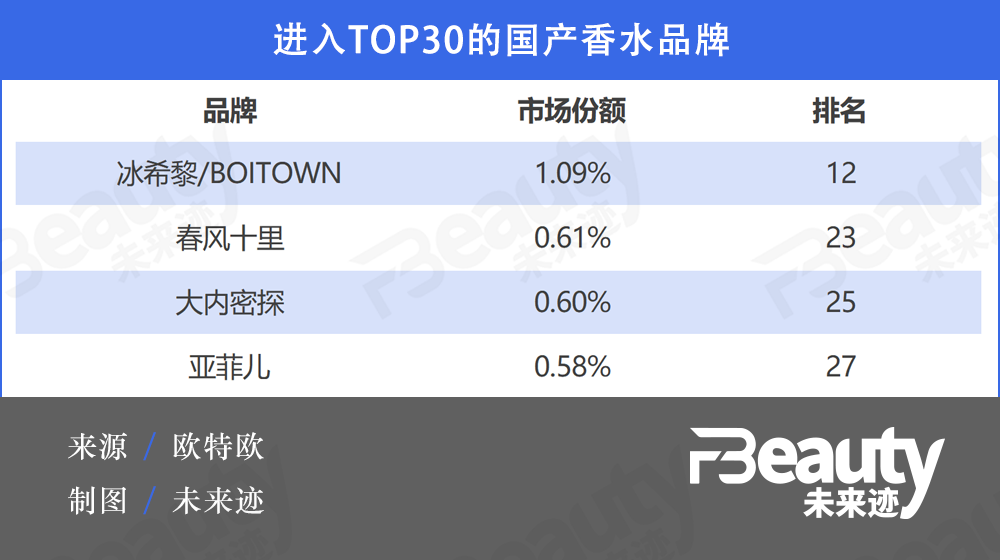 但與此同時(shí),有4個(gè)國貨闖入榜單,分別為冰希黎/BOITOWN、春風(fēng)十里、大內(nèi)密探、亞菲兒。冰希黎以1.09%的市場份額位列國產(chǎn)香水品牌中第一,另外3個(gè)品牌同比銷售額均獲大幅增長,但市占率排位偏后,分別排名23、25、27。