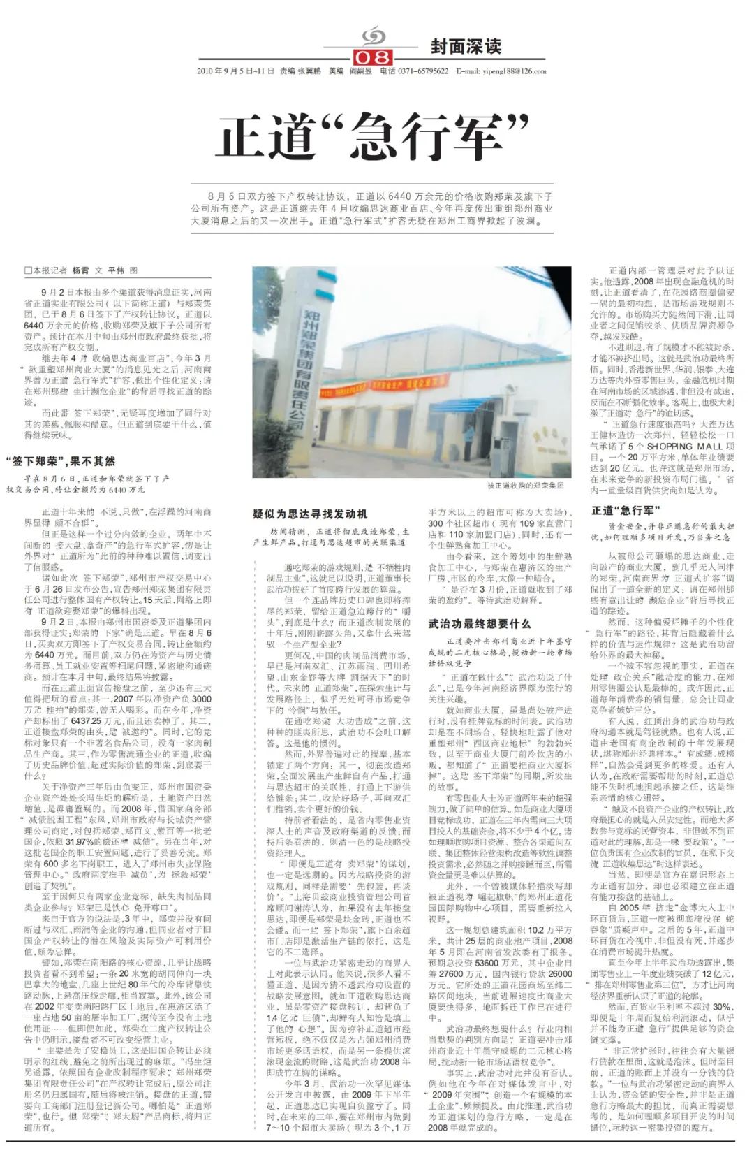2009年,它收編了入不敷出的思達(dá)超市近百家門店,正道思達(dá)隨即成為河南Top10超市零售商。2010年3月,它接盤“破產(chǎn)進(jìn)行時”的鄭州西區(qū)老牌百貨店商業(yè)大廈,同年8月,又將昔日國內(nèi)火腿腸三強(qiáng)之一的鄭榮食品收入囊中,將其更名為鄭州正道鄭榮食品有限公司。