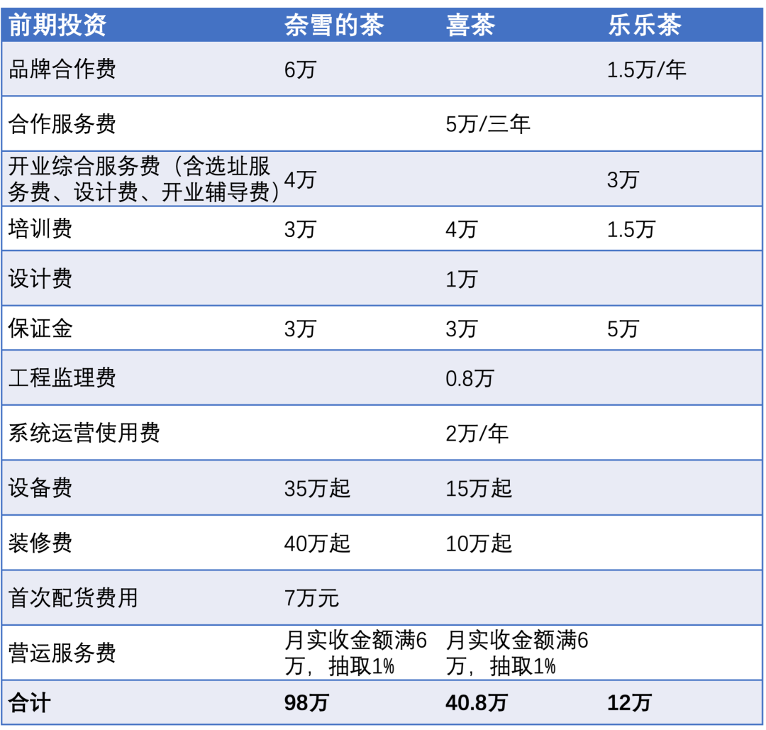 例如,喜茶的加盟門店面積多為50平方米,樂樂茶加盟門店面積的最低要求僅30平方米。奈雪在大店模式下,設(shè)備和裝修兩項費用的預(yù)估投資就高達35萬元和40萬元,遠高于喜茶的15萬元和10萬元。