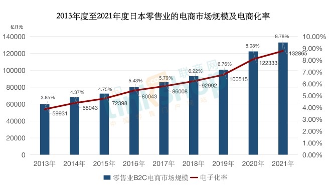2013年度至2021年度日本零售業(yè)的電商市場規(guī)模及電商化率。數(shù)據(jù)來源:日本經(jīng)濟產(chǎn)業(yè)省。制圖:聯(lián)商翻譯中心