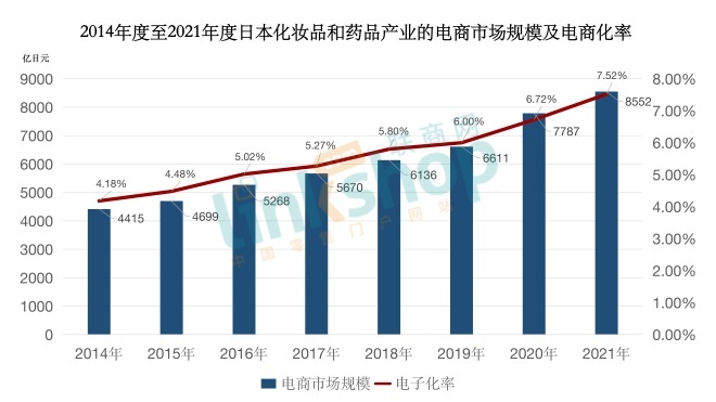 2014年度至2021年度日本化妝品和藥品產(chǎn)業(yè)的電商市場規(guī)模及電商化率。數(shù)據(jù)來源:日本經(jīng)濟產(chǎn)業(yè)省。制圖:聯(lián)商翻譯中心