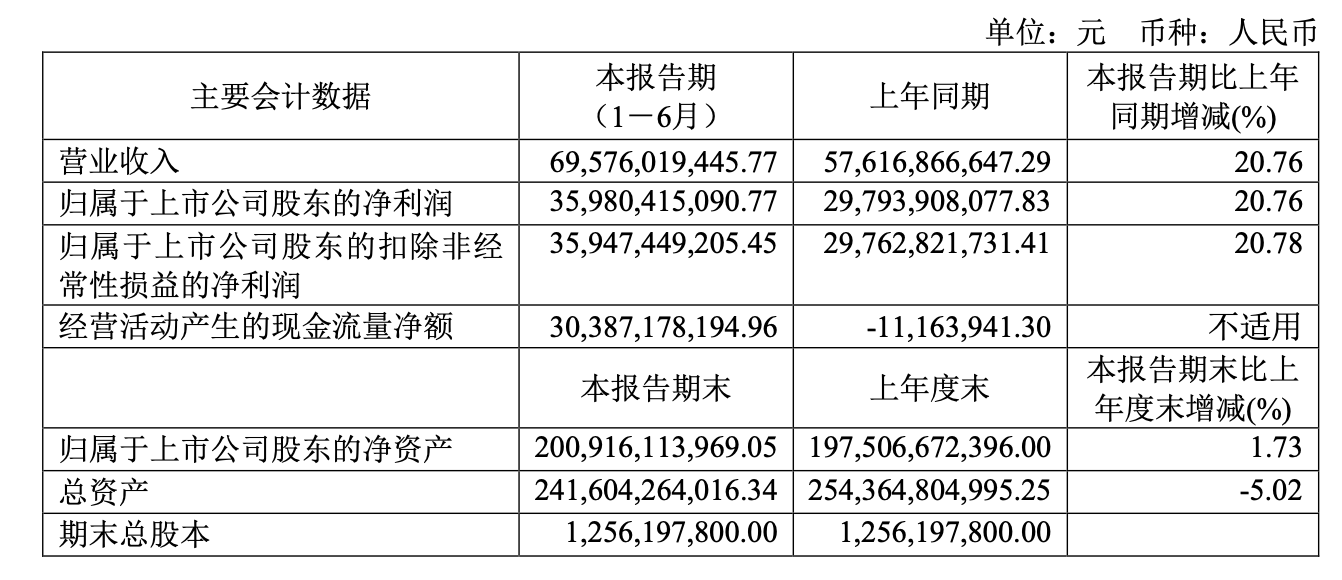 貴州茅臺上半年營收凈利均增長20.76%,日賺近2億
