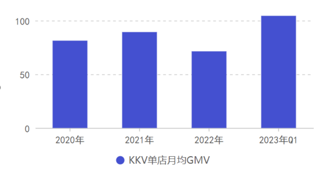 2020-2021年,KKV單店月均GMV分別為81.33萬(wàn)元、89.34萬(wàn)元,2022年受疫情影響,下滑至71.40萬(wàn)元,2023年一季度隨著整體經(jīng)濟(jì)的回暖,單店月均GMV增長(zhǎng)至104.46萬(wàn)元,創(chuàng)下公司單店月均GMV的最高紀(jì)錄。