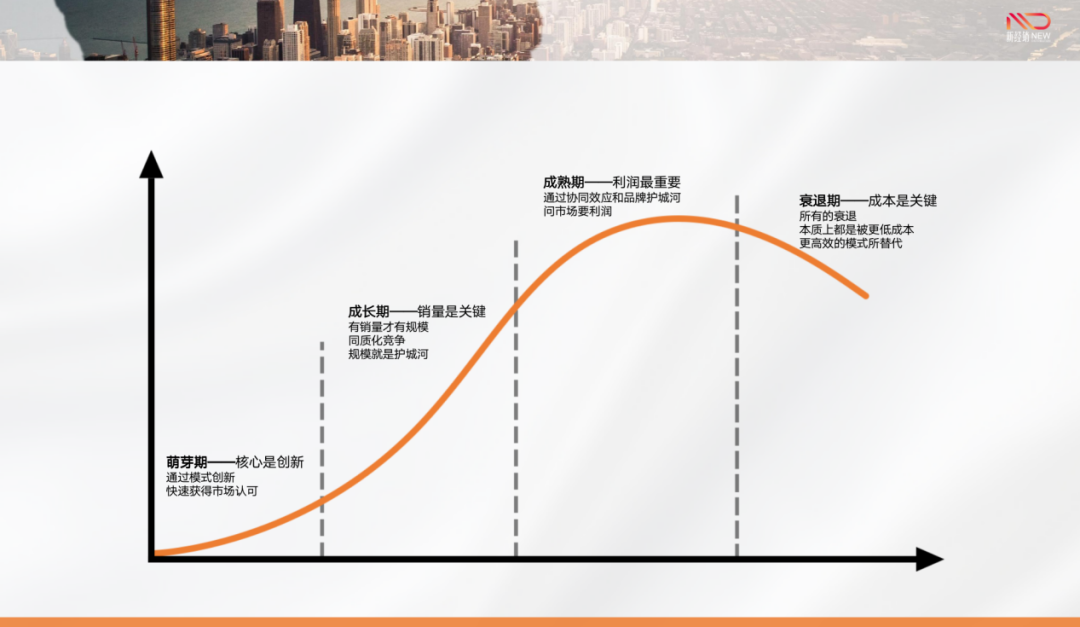 第四階段,衰退期,成本最關(guān)鍵。所有的衰退,本質(zhì)上都是被更低成本、更高效的模式所替代。