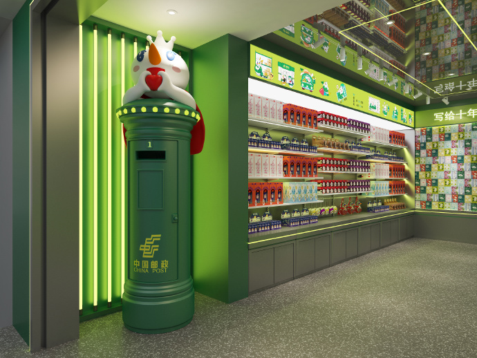 從蜜雪冰城公布的效果圖來看,門店以“蜜雪冰城主題郵局”為門頭,門口設(shè)有一個“雪王版郵筒”。門店內(nèi)部整體以綠色為主基調(diào),其中一面墻布置了簡易就餐區(qū)和蜜雪周邊產(chǎn)品展示區(qū),另一面墻則設(shè)置了以“寫給十年后的自己”為主題的留言板。