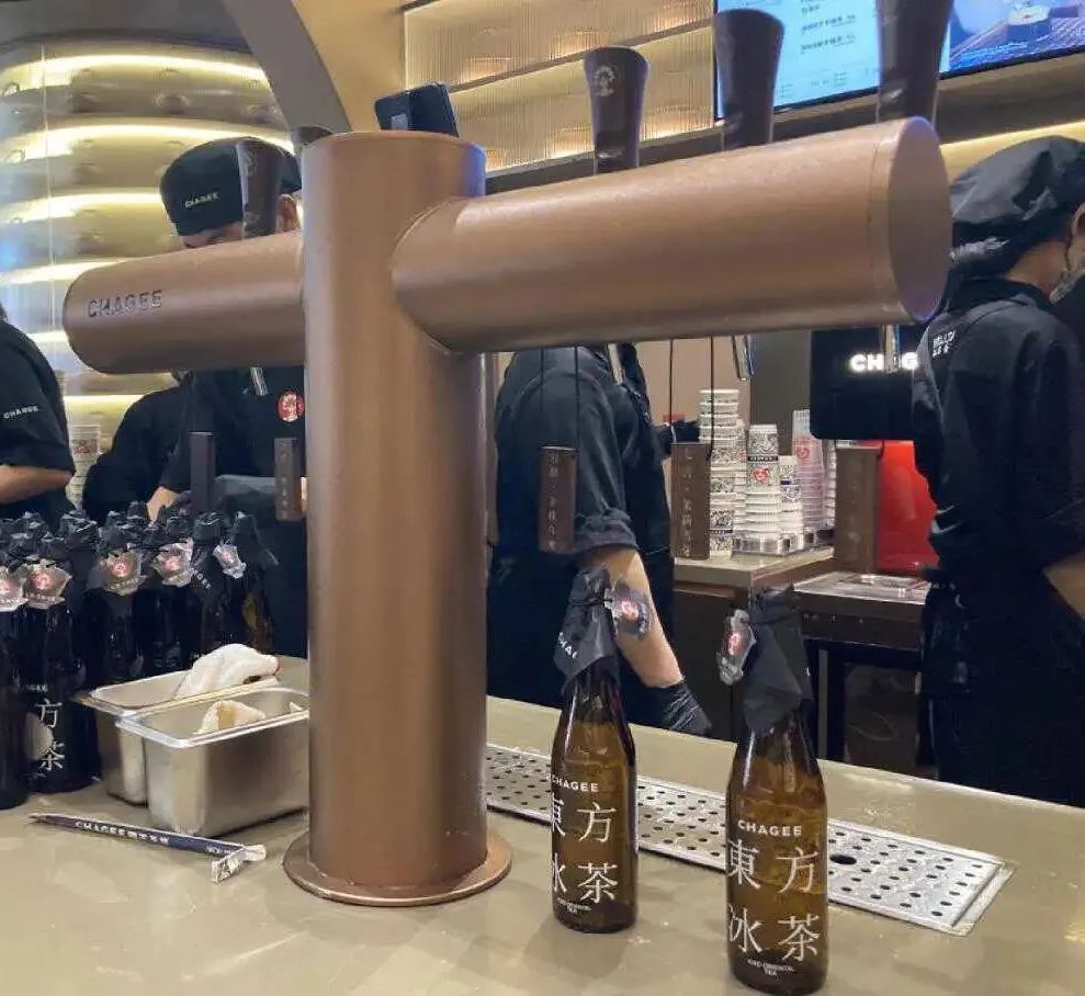 比如,在東方冰茶的灌注設(shè)備上,不同出品龍頭都懸掛有相應(yīng)的茶的品類標識,如糯香綠茶、陳柑普洱、茉莉雪芽等,而在出品環(huán)節(jié)則通過特質(zhì)的玻璃瓶進行灌注,這些設(shè)計讓年輕消費者更近一步接觸“茶”文化的同時,也讓年輕人為由“茶”產(chǎn)生的創(chuàng)意表達方式所吸引。
