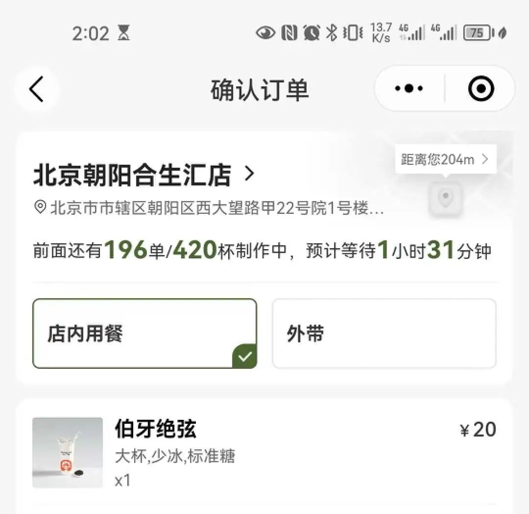 氫消費在2點02時,通過掃門店中的點餐二維碼看到,此時前面共有196單/420杯飲品正在制作中,預(yù)計等待時長一個半小時。