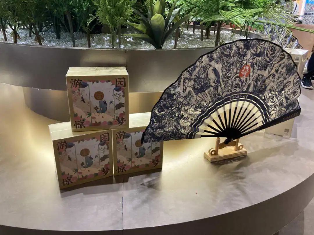 步入門店的入口處,充滿濃郁國風(fēng)的霸王茶姬相關(guān)的周邊零售產(chǎn)品,被擺放在門口的圓形展臺上,包括“游園驚夢”國風(fēng)茶包禮盒以及折扇。