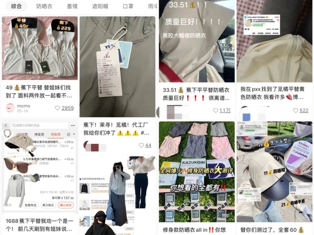 陳晶此前只買蕉下一類品牌的防曬裝備,但如今她也開始搜尋“平替”,“現(xiàn)在的防曬衣樣式太多了,如果每件都買品牌的真的很貴,看網(wǎng)上各種測評其實防曬效果也差不多,那還不如直接沖平替!