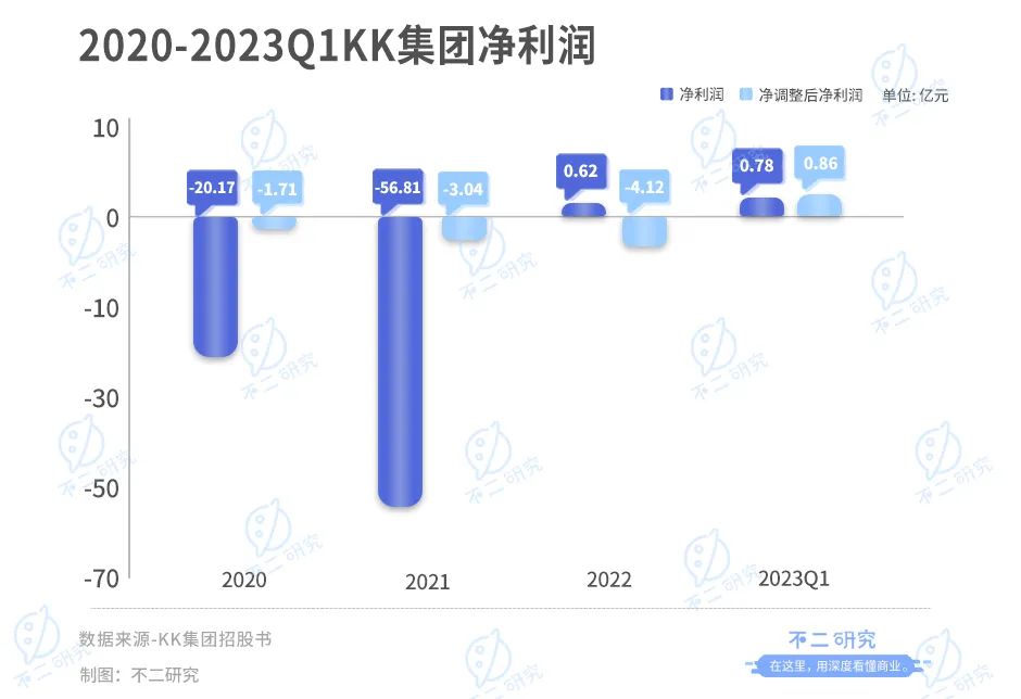 據(jù)其招股書(shū)顯示,2020-2022年及2023年一季度,KK的總營(yíng)收為16.46億元、35.24億元、35.51億元及14.46億元;同期,其凈利潤(rùn)為-20.17億元、-56.81億元、0.62億元及0.78億元。