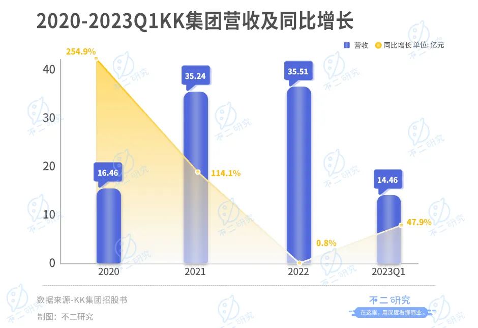 「不二研究」注意到,KK的營(yíng)收增速已明顯放緩,2020-2021年同比增長(zhǎng)分別為254.9%、114.1%,而2022年增速幾乎陷入停滯,同比增長(zhǎng)僅為0.8%。