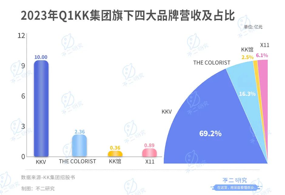 招股書(shū)數(shù)據(jù)顯示,2023年一季度KKV、THE COLORIST、KK館、X11分別貢獻(xiàn)了10.00億元、2.36億元、0.36億元、0.89億元營(yíng)收,占總營(yíng)收比重為69.2%、16.3%、2.5%和6.1%。