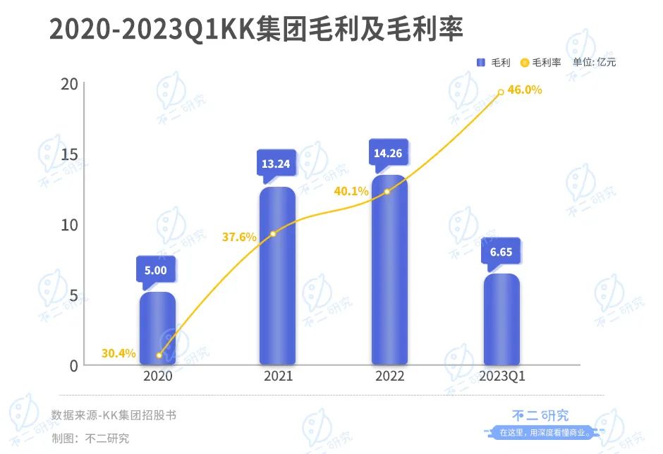 從毛利來(lái)看也是如此。2020-2022年及2023年一季度,KK的毛利分別為5.00億元、13.24億元、14.26億元及6.65億元,其中2020-2021年呈現(xiàn)翻倍式上漲,同比增長(zhǎng)164.8%,但2022年增速斷崖式下跌,僅有7.70%。