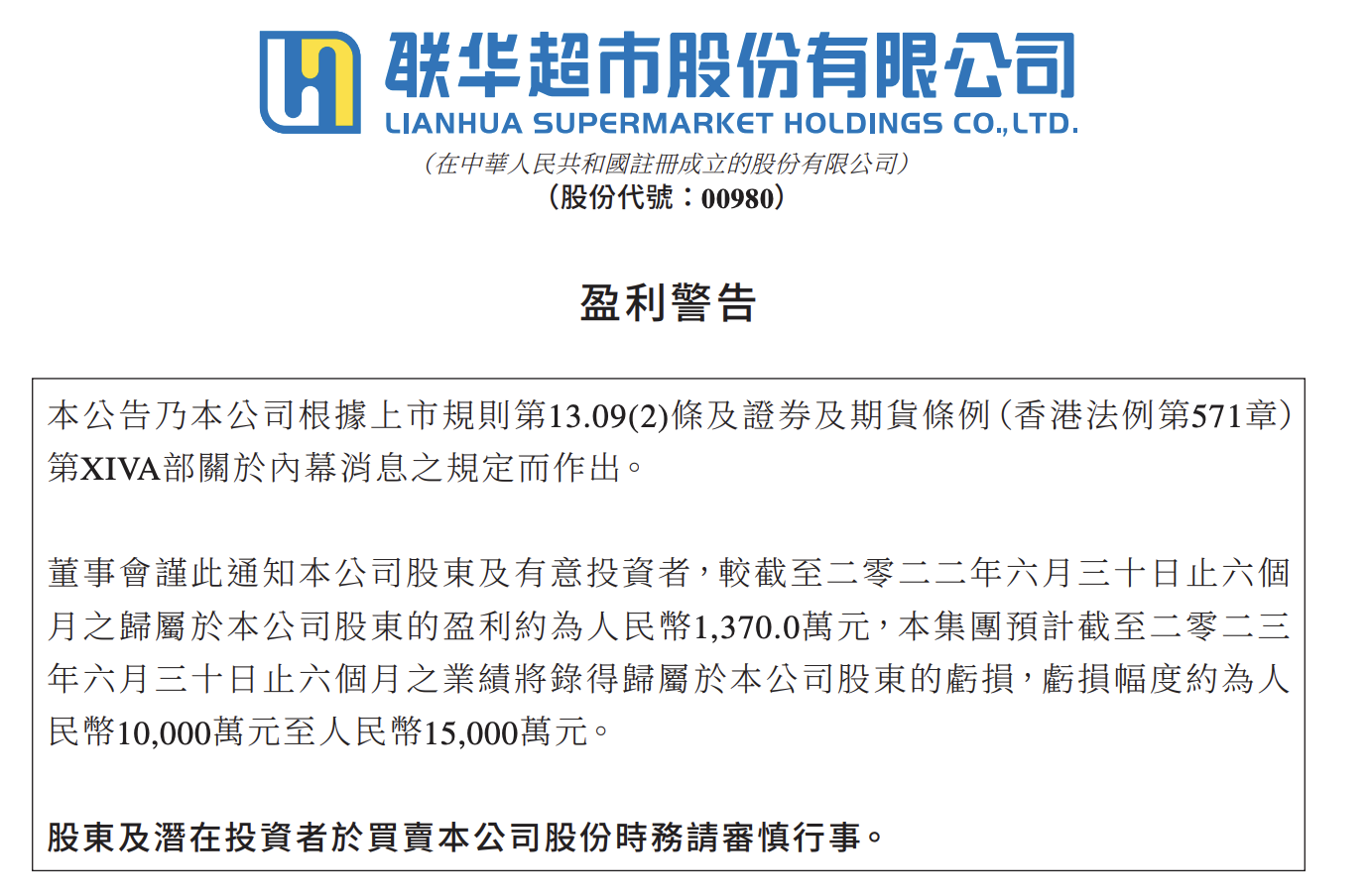 聯(lián)華超市預(yù)計(jì)上半年虧損1億元-1.5億元