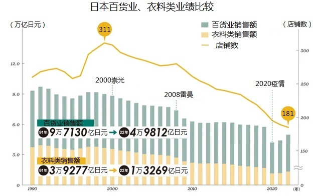 據(jù)日本百貨商店協(xié)會(huì)統(tǒng)計(jì),2022年全國百貨店銷售額為4.9812萬億日元,同比增長(zhǎng)13.1%。與2019年相比減少11.1%。雖然企業(yè)決算月份有些差異,但是總體相當(dāng)于疫情前銷售業(yè)績(jī)的90%。地方和郊外大眾百貨店加速關(guān)門,山形縣和德島縣已經(jīng)沒有百貨店了。