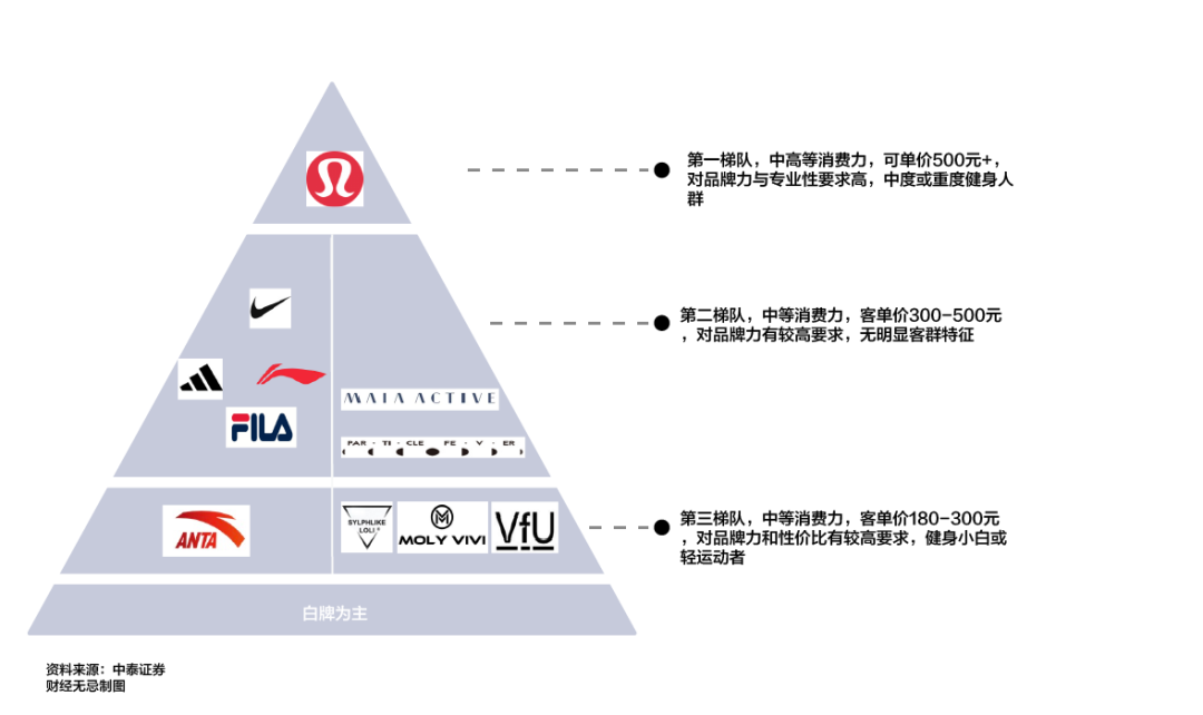 觀察來看,目前女子運動時尚整體也已形成一座品牌金字塔結(jié)構(gòu),lululemon依舊在高端市場占領(lǐng)消費者心智,本土品牌大多集中在中端以及中高端的市場,根據(jù)不同的產(chǎn)品定位形成了用戶的分層;低端市場則是以一些供應(yīng)商白牌為主。
