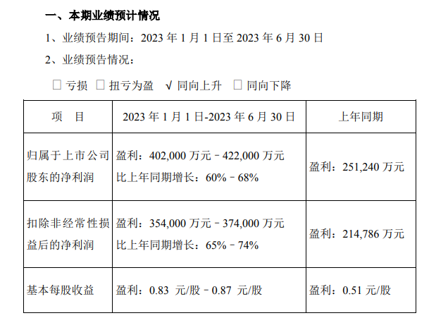 業(yè)績預告顯示,2023年上半年預計歸屬于上市公司股東的凈利潤為40.2億-42.2億元,同比增長60%-68%,扣除非經(jīng)常性損益的凈利潤為35.4億-37.4億元,同比增長65%-74%。