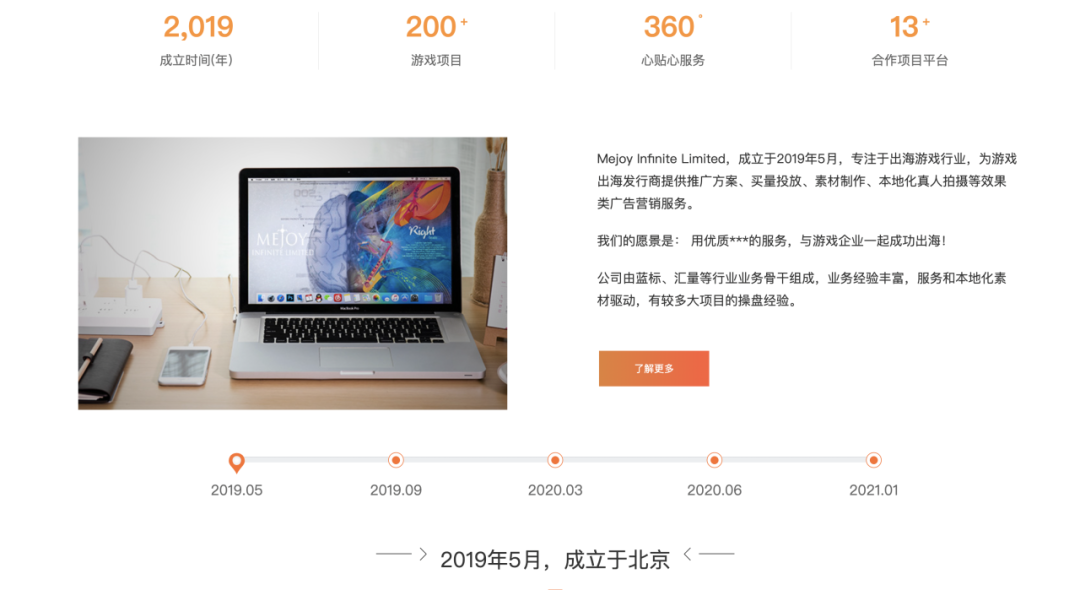 市場(chǎng)上關(guān)于公司Mejoy的信息不多,我們僅通過(guò)“領(lǐng)英”了解到,其大股東嚴(yán)人杰畢業(yè)于山東科技大學(xué)。同時(shí),Mejoy官網(wǎng)介紹,其成立于2019年,管理層來(lái)自于廣告公司藍(lán)標(biāo)、匯量等,主要為出海企業(yè)提供推廣方案、買量投放、素材制作、本地化真人視頻拍攝等效果類廣告營(yíng)銷服務(wù)。