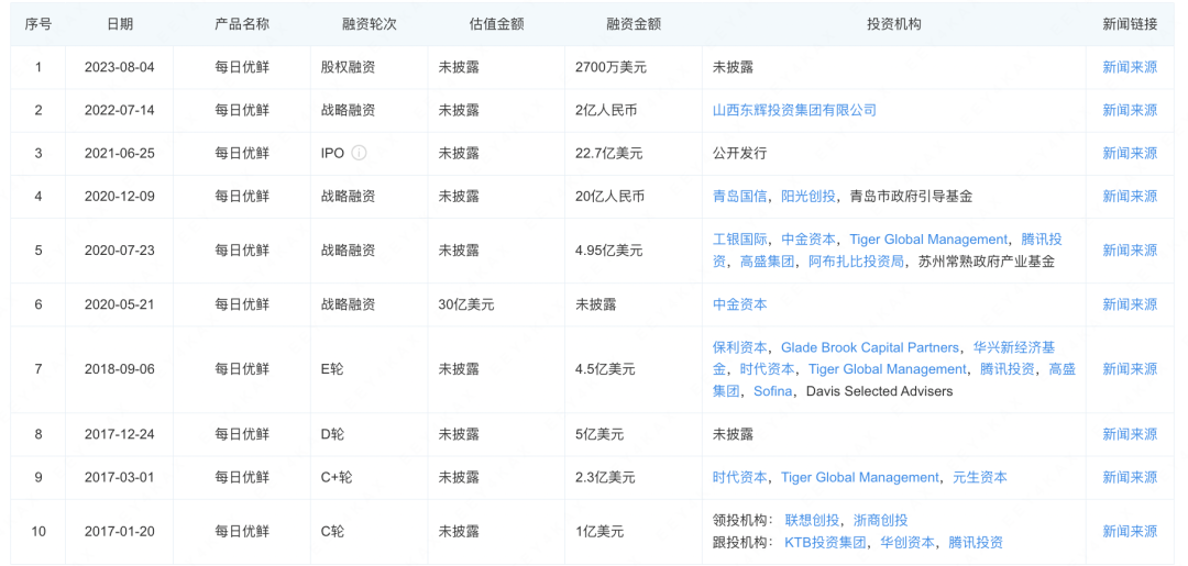 而據(jù)企查查監(jiān)測(cè),每日優(yōu)鮮創(chuàng)立以來(lái)的總?cè)谫Y規(guī)模在172.70億元左右(其中包括IPO前的18.17億美元和24.3億元人民幣融資,以及IPO輪扣除承銷傭金、折扣、發(fā)行費(fèi)用后的2.472億美元,按2023年8月7日美元兌人民幣匯率7.1895計(jì)算)。