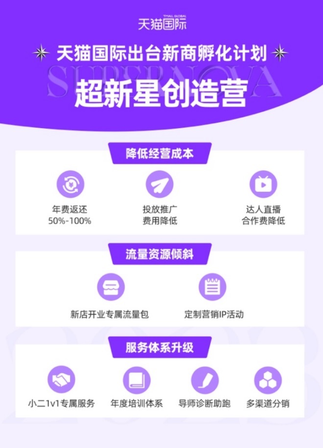 近日,天貓國際推出新商孵化計劃 “超新星創(chuàng)造營”,投入上億基金,推出減免年費,贈送直播流量等新店開業(yè)服務(wù)和年度成長計劃,預(yù)計3年內(nèi)扶持1000個全球新品牌,從品類新星成長為超新星品牌。