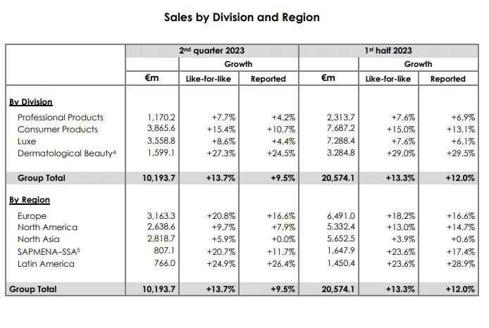 同樣是今年的上半年,歐萊雅的大眾化妝品部門銷售規(guī)模罕見重回四大業(yè)務(wù)部門第一,增速達(dá)15%,高端化妝品部門的銷售規(guī)模雖然緊隨其后排名第二,但增速墊底,僅為7.7%。