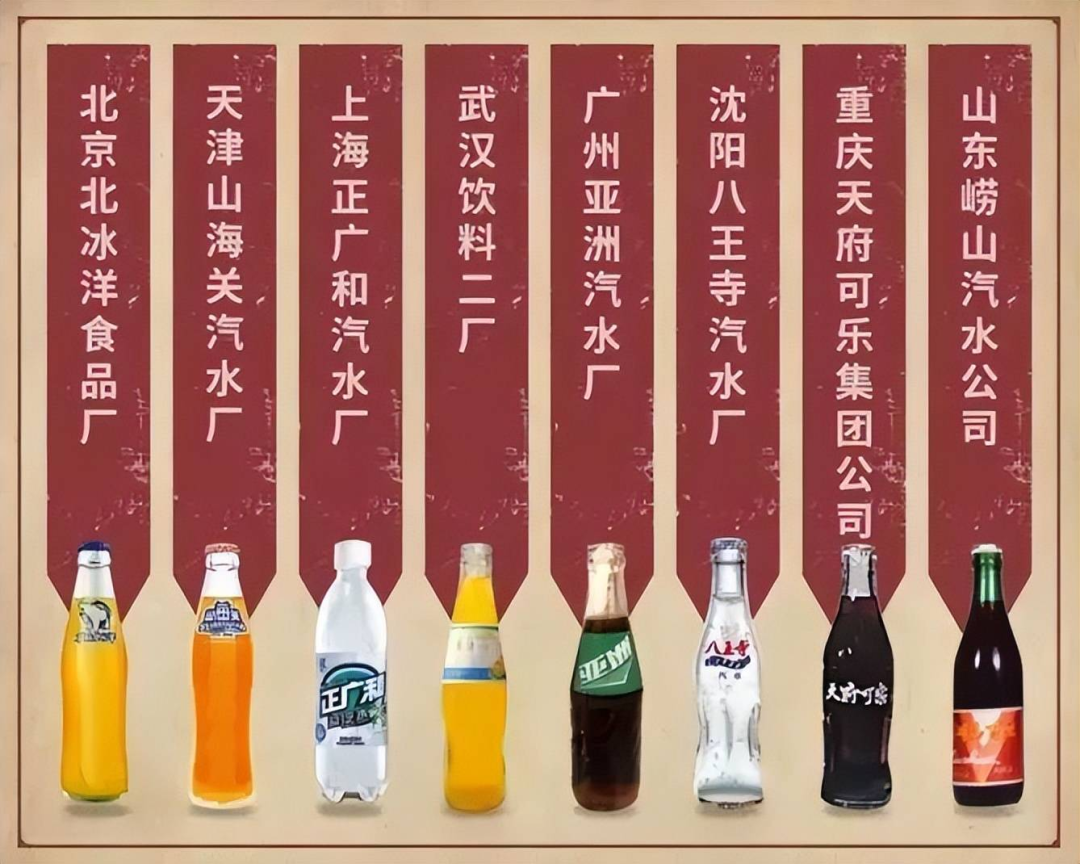 每個地方都有自己的代表性汽水,上世紀風靡一時的北京北冰洋、沈陽八王寺、武漢二廠、天津山海關、青島嶗山、武漢濱江、重慶天府可樂、廣州亞洲汽水,都曾是一代人的集體記憶。由于這些汽水品牌多為國營廠出品或國有經營,因此被人們稱為“八大汽水廠”或“國產汽水八雄”。