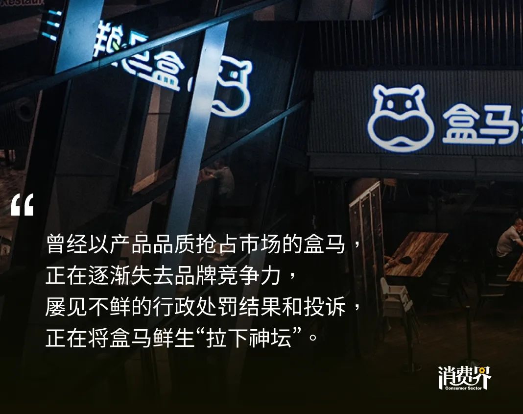有媒體分析認為:過去消費者之所以選擇產品價格更高的盒馬鮮生,追求的是新零售模式下更優(yōu)質的產品質量。而屢見不鮮的行政處罰結果和投訴,正在將盒馬鮮生“拉下神壇”,失去核心競爭力后,盒馬也將慢慢失去消費者的心。