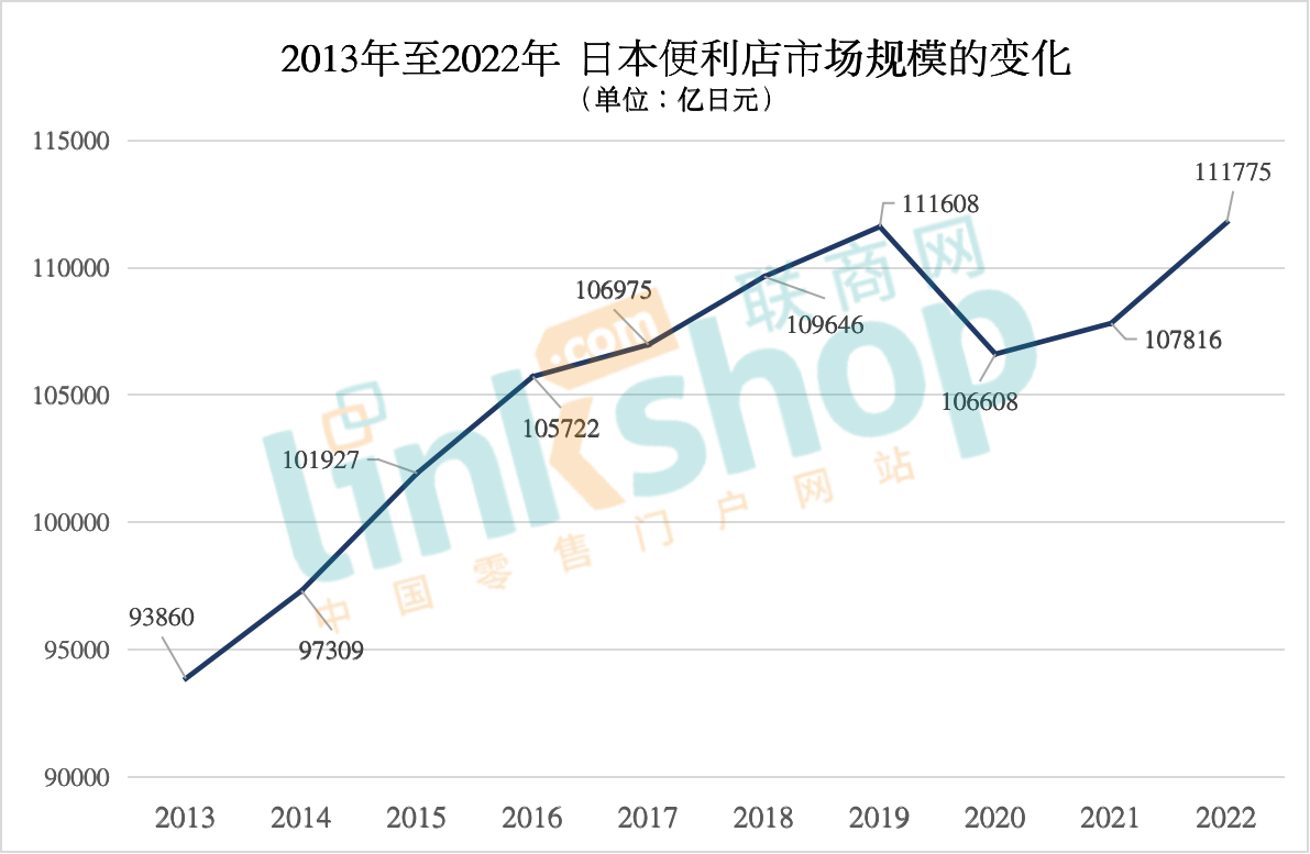 然而,在新冠疫情已趨向平息的今天,日本便利店行業(yè)卻呈現(xiàn)出驚人的V字型復(fù)蘇。最新數(shù)據(jù)顯示,2022年市場(chǎng)規(guī)模同比增長(zhǎng)3.7%,達(dá)到111775億日元,恢復(fù)到超過(guò)2019年冠狀病毒爆發(fā)前的水平(111608億日元)。