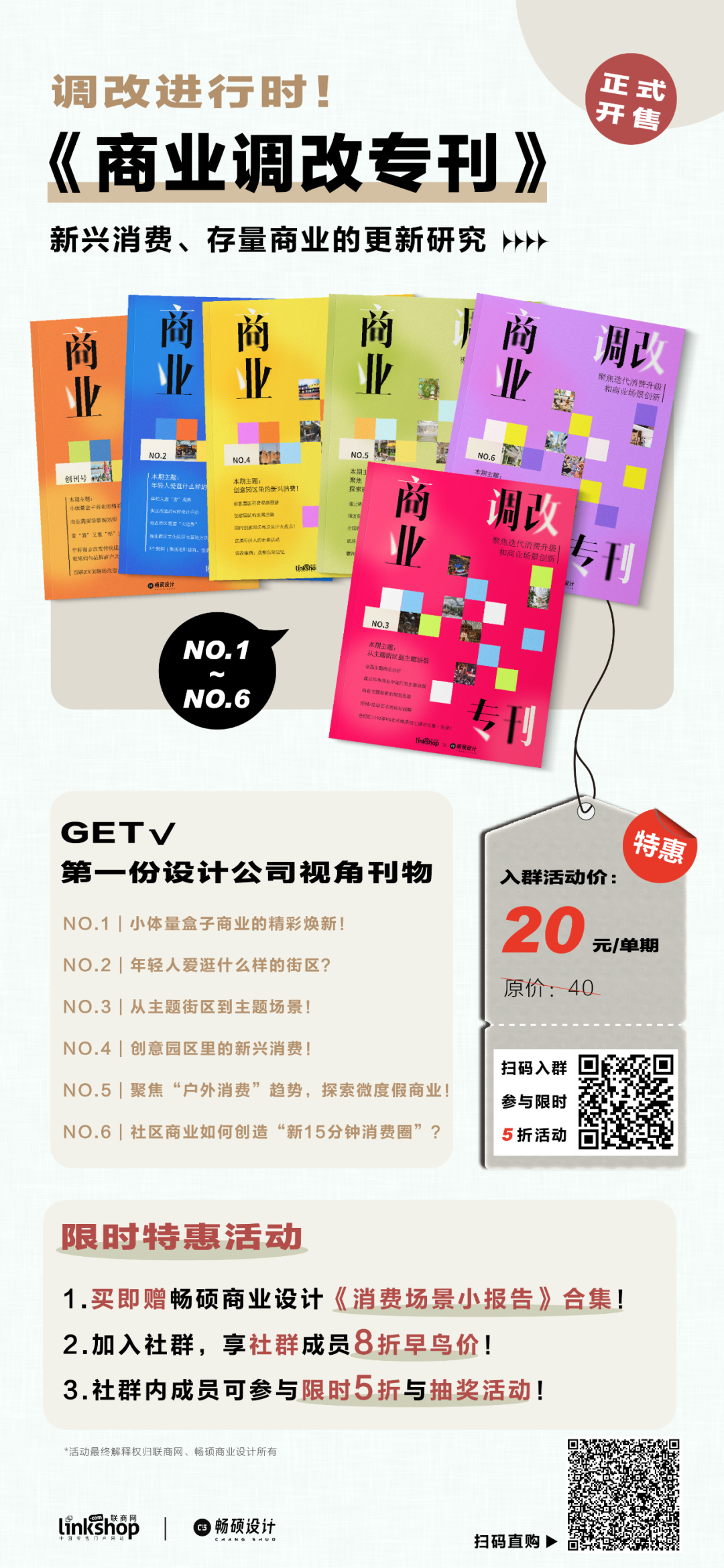 為進(jìn)一步觸達(dá)行業(yè),幫助更多人取得存量商業(yè)調(diào)改的真經(jīng),經(jīng)聯(lián)商網(wǎng)和暢碩商業(yè)設(shè)計(jì)共同討論決定,現(xiàn)將已問世的6期《商業(yè)調(diào)改?芬噪娮影娴男问竭M(jìn)行線上發(fā)售,用戶可以自行選擇購買單期專刊,也可以選擇6期套裝。