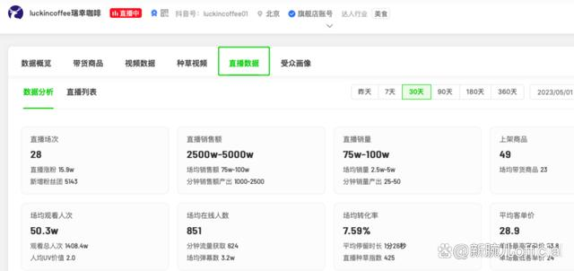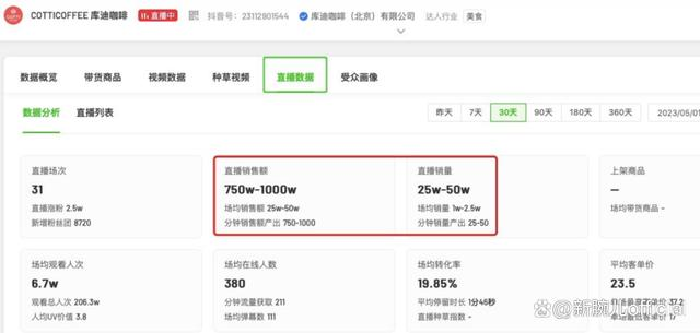 飛瓜數(shù)據(jù)顯示,5月庫迪的抖音直播銷售額在750萬-1000萬,場均銷售額是25萬-50萬;同一時間,瑞幸的成績則是銷售額2500萬-5000萬,場均銷售額75萬-100萬。