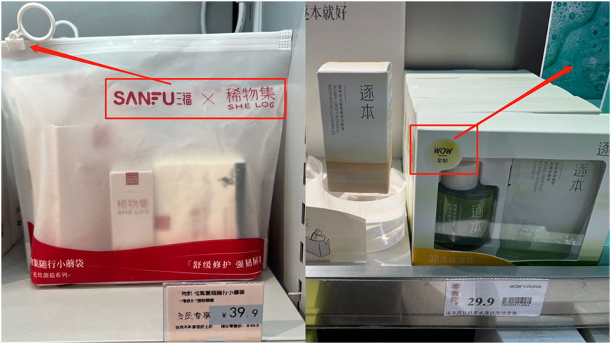 此外,一些零售連鎖還與品牌推出定制的體驗套裝,比如三福定制款的稀物集松茸菌菇隨行小蘑袋和WOW COLOUR定制的逐本清歡植萃水漾潔顏油套裝。