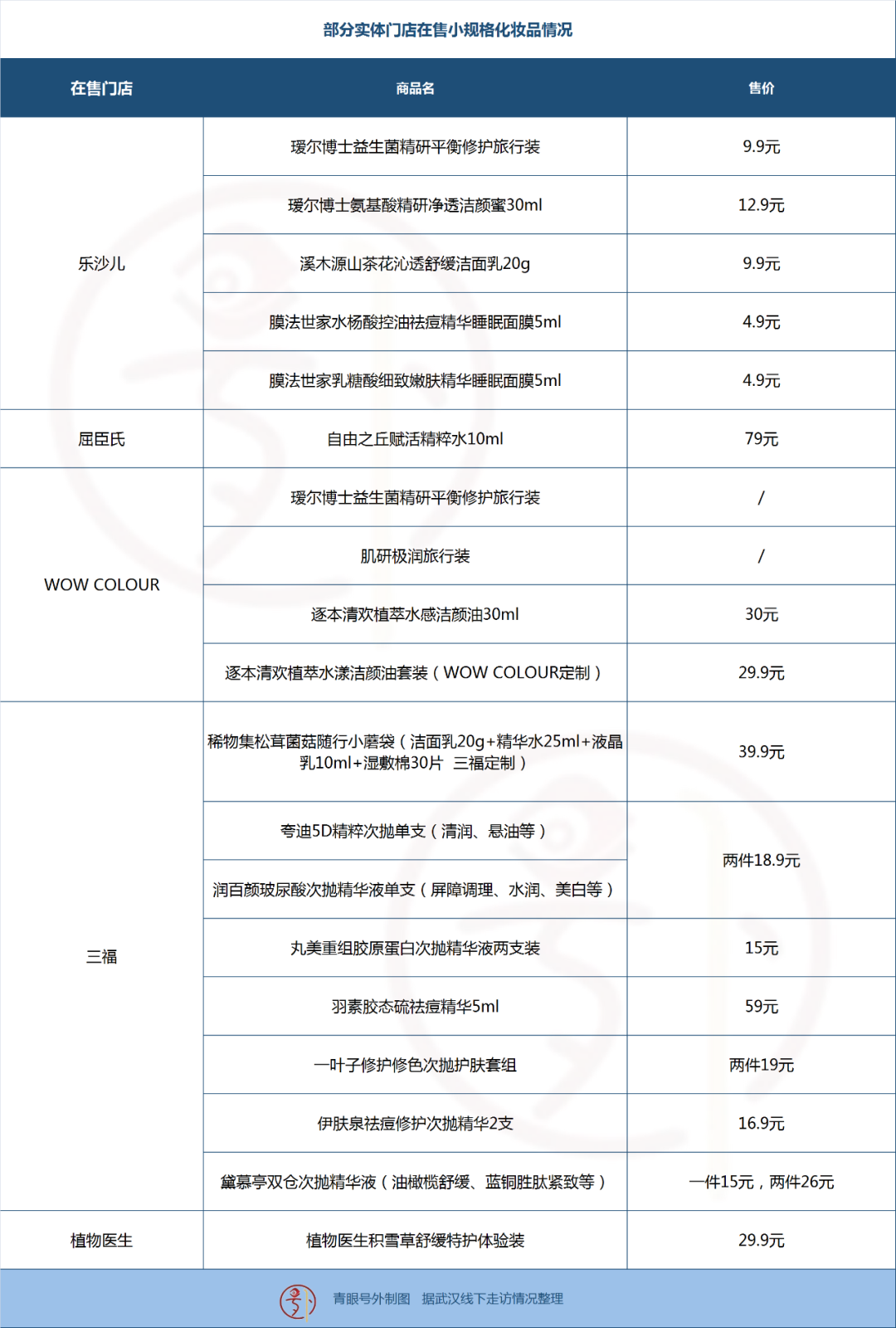 青眼號外在武漢走訪屈臣氏、三福、WOW COLOUR、樂沙兒、植物醫(yī)生等門店時也注意到,過去的小樣/體驗裝逐漸“上位”,從“贈品”變身為“商品”,小規(guī)格的體驗裝、旅行裝產(chǎn)品并不少見,近兩年流行的次拋精華也衍生出單支或兩支的小包裝產(chǎn)品。