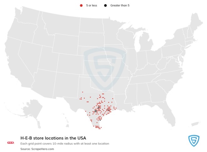 截至2023年7月18日,H-E-B在全美唯一一個(gè)州——得克薩斯州,經(jīng)營(yíng)著327家超市,覆蓋152座城市。圖源:ScrapeHero