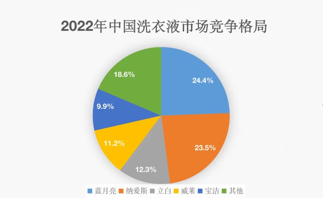 另據(jù)華經(jīng)產(chǎn)業(yè)研究院的數(shù)據(jù),2022年我國洗衣液行業(yè)市場集中度較高,CR5占比超過80%,分別為藍(lán)月亮、納愛斯、立白、威萊、寶潔。其中藍(lán)月亮占比最重,為24.4%,其次為納愛斯23.5%。