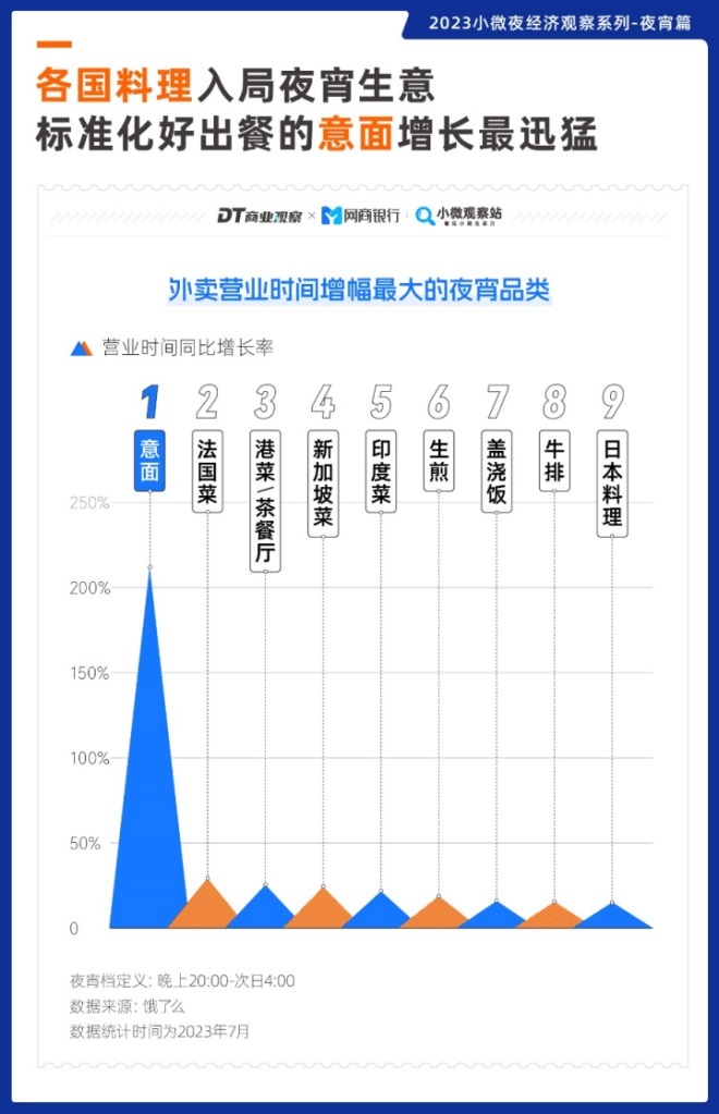 在夜宵品類上,各國料理店鋪也紛紛入局,標準化成為關鍵。標準化程度高的意面品類,營業(yè)時長悄悄翻了2倍,進入了夜宵檔,而像法國菜、港式茶餐廳、新加坡菜、印度菜等非傳統(tǒng)夜宵檔的品類,營業(yè)時長均同比增長了20%以上,是增長最多的品類。