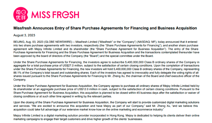 根據(jù)每日優(yōu)鮮所發(fā)布的公告顯示,公司已經(jīng)和兩位投資者分別簽訂了股份購買協(xié)議,累計認(rèn)購每日優(yōu)鮮54億股,總價值為2700萬美元(約合人民幣1.94億)。