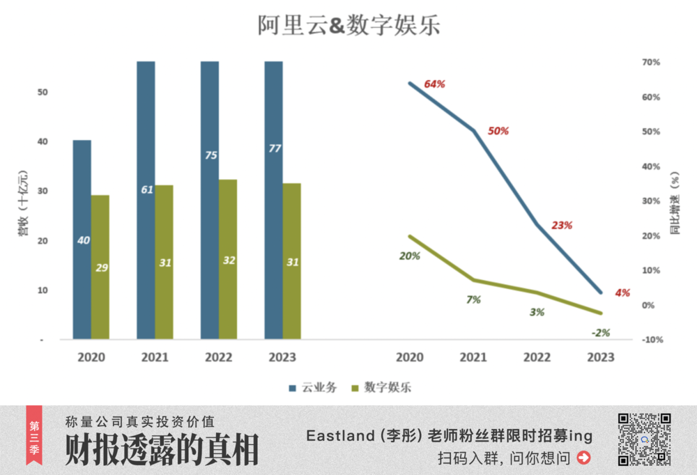 數(shù)字媒體及娛樂主要包括優(yōu)酷、阿里影業(yè)(01060.HK)、夸克三大平臺(tái)。2023財(cái)年,數(shù)字娛樂板塊營(yíng)收315億、同比下降2%。