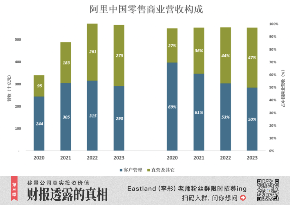 2023財(cái)年,中國(guó)零售客戶管理收入2904億、同比下降7.8%;直營(yíng)收入2750億、同比增長(zhǎng)5.4%?蛻舴⻊(wù)、直營(yíng)合計(jì)占中國(guó)商業(yè)營(yíng)收的97%。