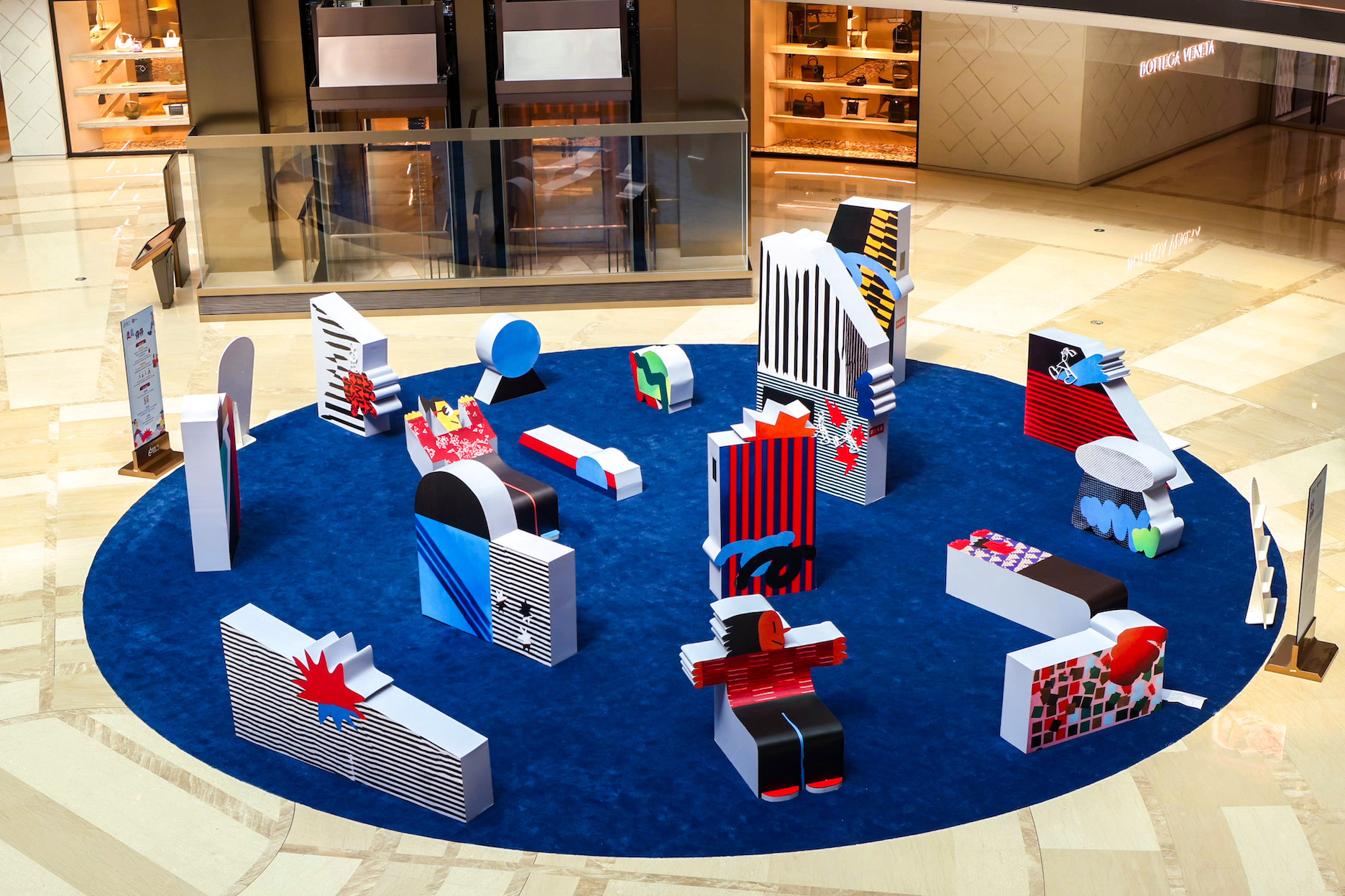南座中庭則是放置了《書上的書》主題裝置,藝術(shù)家雷磊用旗幟、地毯、積木模板等素材,創(chuàng)作出了立體形態(tài)的“書”;此次在港匯恒隆,藝術(shù)家更獨(dú)具匠心地將原來的積木尺寸放大了10倍,陳列在中庭的圓形地毯上。在這其中,還有三個(gè)人物形態(tài)的座椅,他們都張開雙臂,要在這個(gè)夏日送上一個(gè)熱情的擁抱。特別的幾何色塊與拼貼圖片構(gòu)成的這個(gè)藝術(shù)裝置與商業(yè)空間完美融合,讓你穿行其中,能夠找回內(nèi)心的純真與活力,重拾對生活的好奇與樂趣。