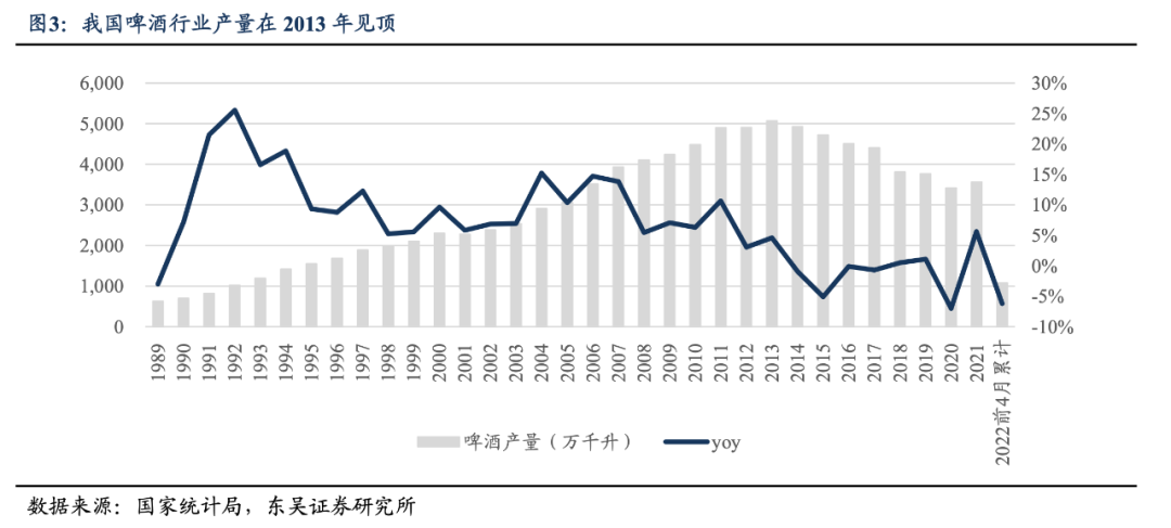 1980年-2013年,中國啤酒產(chǎn)量持續(xù)增長,年復(fù)合增速約為13%,最高年同比增速超過40%。2013年,國內(nèi)啤酒總產(chǎn)量達(dá)到5062萬噸的歷史峰值,此后直到2020年,全國啤酒產(chǎn)量連續(xù)7年滑落。