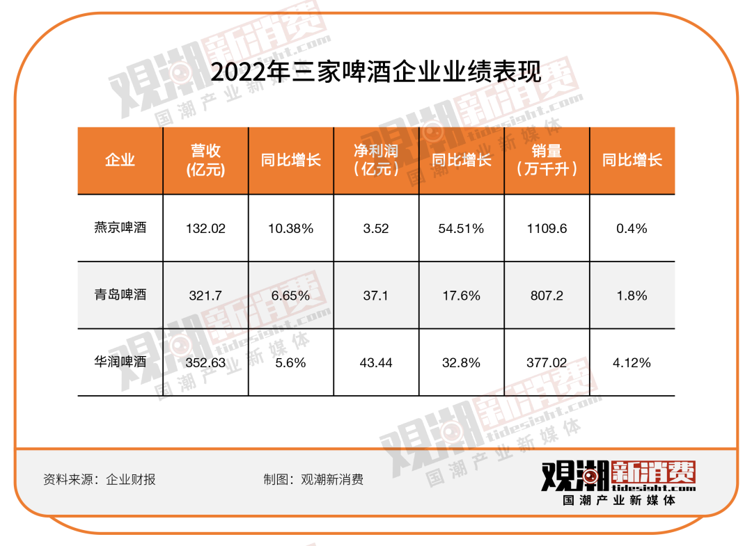 如圖所示,三家啤酒企業(yè)的營收增幅大于銷量增幅,凈利潤增幅大于營收增幅,已初步完成了向存量要增量的目標(biāo),也印證了高端化方向的正確性。