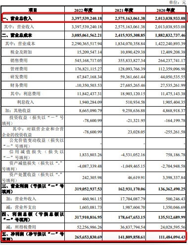 整體來看,乖寶寵物近三年的營收和業(yè)績均呈現(xiàn)增長趨勢。招股書中合并利潤表顯示,2020-2022年,公司實現(xiàn)的營業(yè)收入分別為20.13億元、25.75億元和33.98億元。這其中,公司自有品牌銷售收入占主營業(yè)務(wù)收入比重分別為49.55%、51.95%和60.55%,尤其是在2022年賣出了20.46億元,年均復(fù)合增長率達(dá) 43.53%。