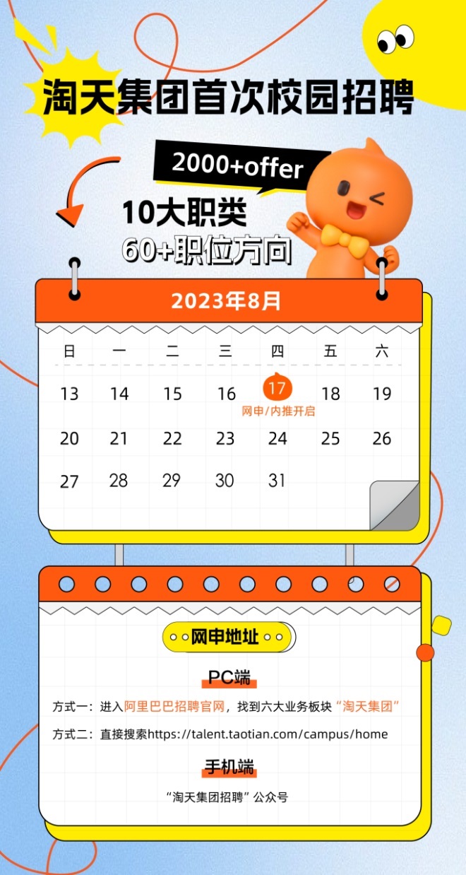 8月17日,淘天集團(tuán)秋季2024屆校園招聘正式啟動,預(yù)計將發(fā)放2000多個offer。這是淘天集團(tuán)成立以來第一次啟動校招。