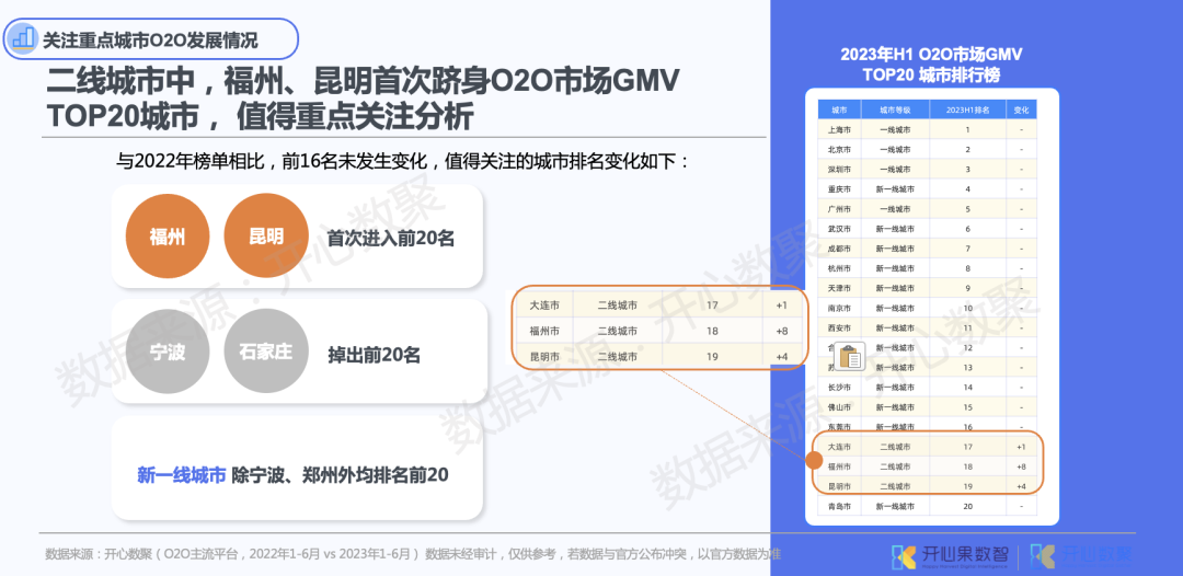 從城市O2O市場(chǎng)GMV排行榜來(lái)看,較去年榜單相比,前16名未發(fā)生變化;福州、昆明首次躋身前20,而寧波、石家莊則掉出排行榜;新一線城市除寧波、鄭州外均排名前20。